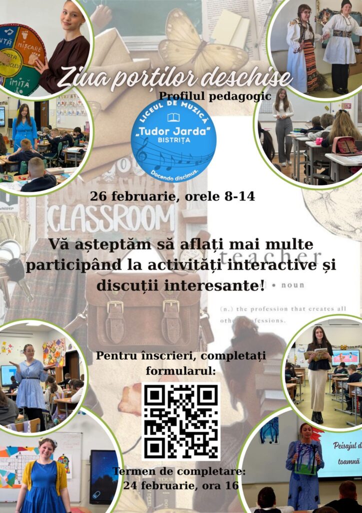 Ziua Porților Deschise – Profilul Pedagogic Liceul de Muzică „Tudor Jarda” Bistrița vă invită să descoperiți universul educației la Ziua Porților Deschise, cu ocazia Zilelor „Tudor Jarda” Când? – 26 februarie, interval 08:00 – 14:00 Vă așteptăm să aflați mai multe despre profilul pedagogic, să participați la activități interactive și să luați parte la discuții