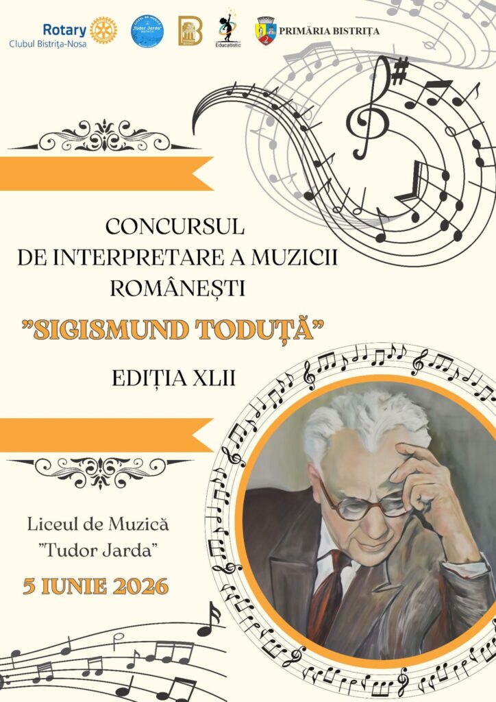 Vă invităm cu drag la cea de-a XLII-a ediție a Concursul Național de Interpretare a Muzicii Românești ”Sigismund Toduță” Veniți să susțineți tinerele talente și să vă bucurați de frumusețea compozițiilor autohtone într-un eveniment de tradiție pentru comunitatea noastră. Când? 5 Iunie 2026 Unde? Liceul de Muzică „Tudor Jarda”, Bistrița Evenimentul este organizat cu