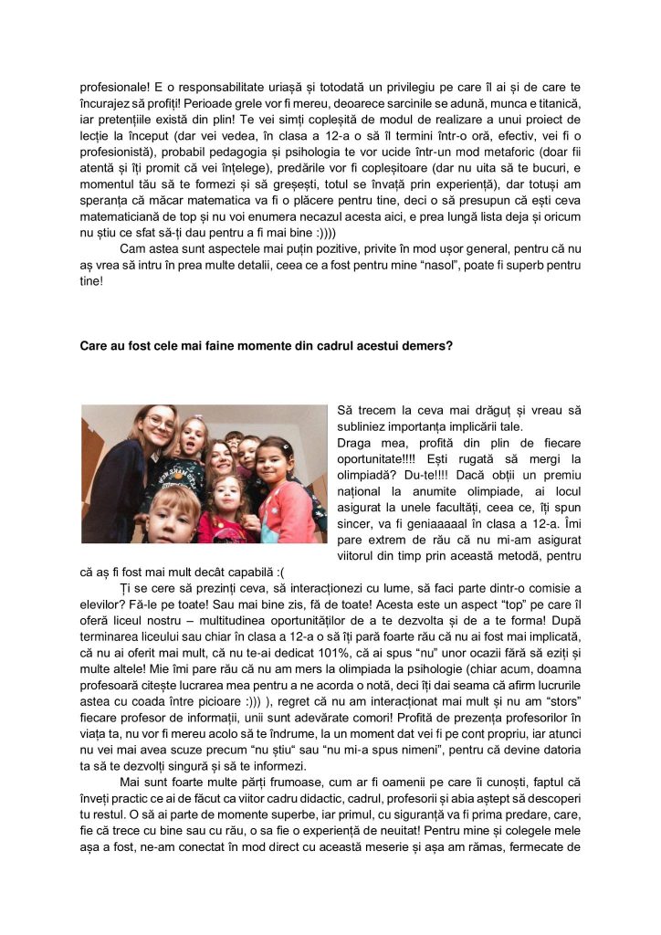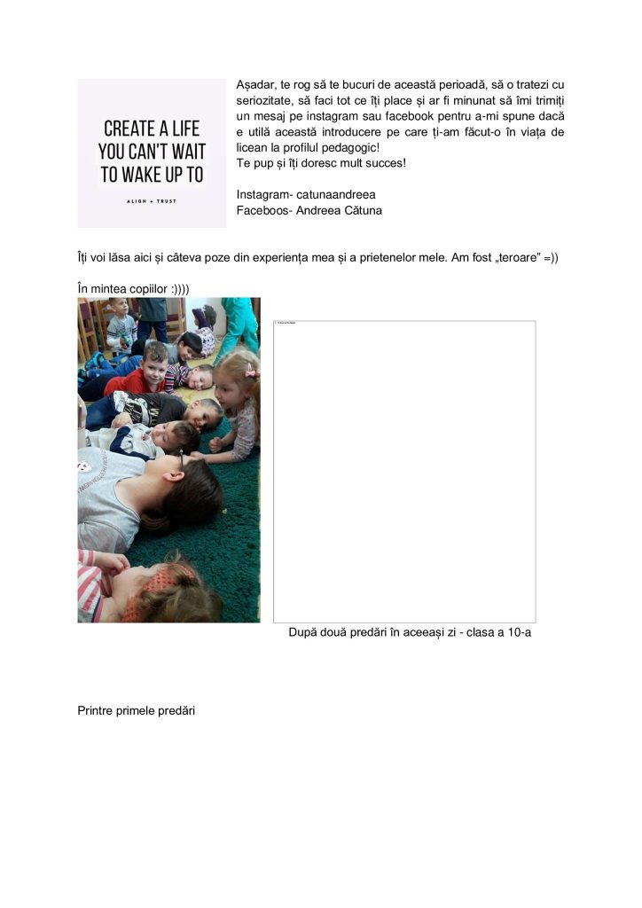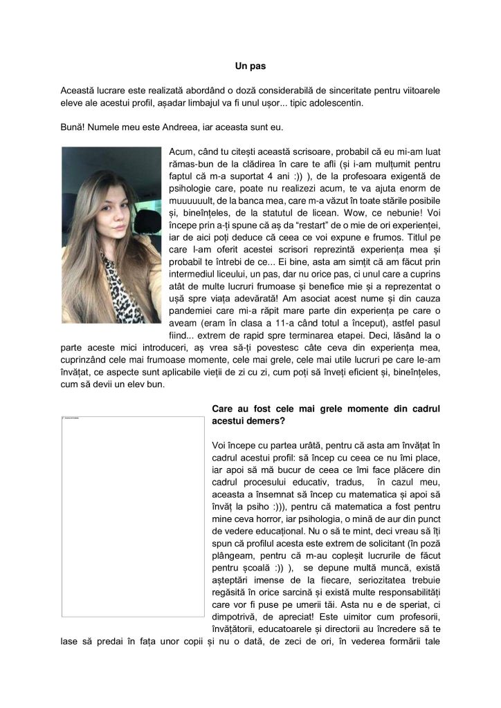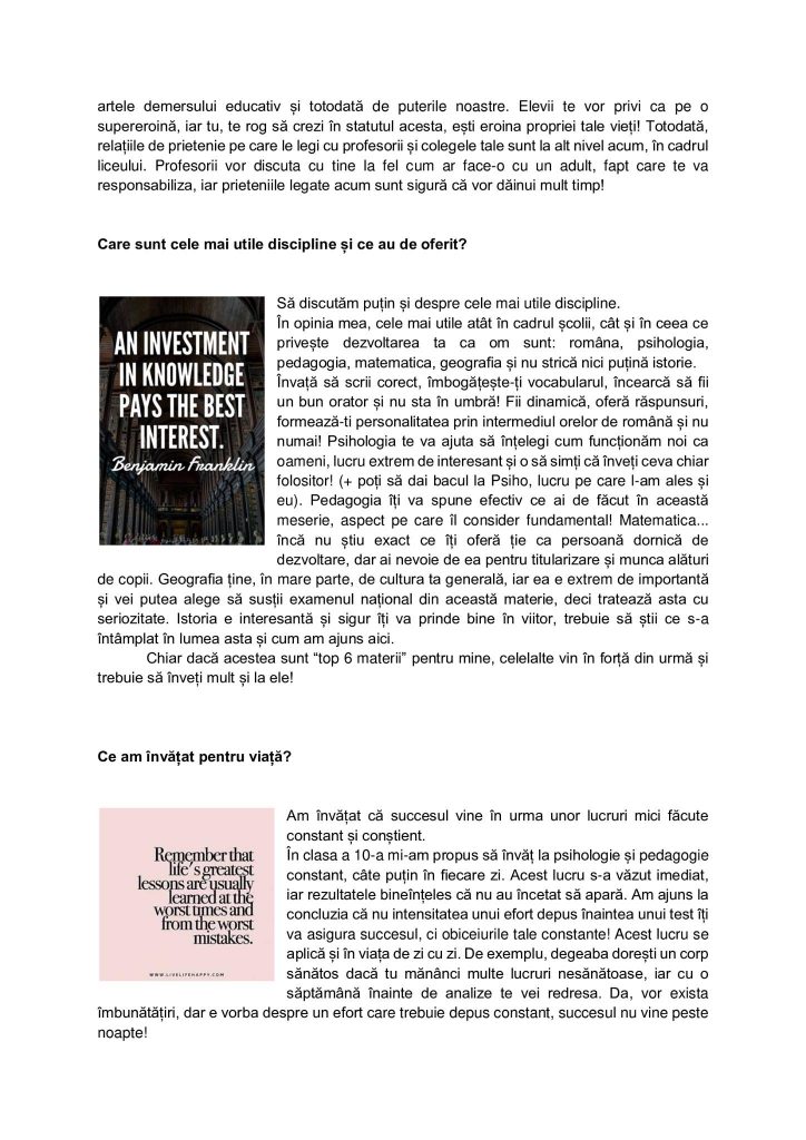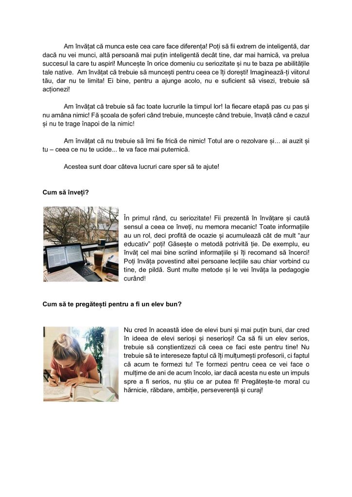 O altă scrisoare către viitorii elevi a clasei a IX-a profil Pedagogic, de la Andreea Cătuna-Croitor din clasa a XII-a B:”Ce am învățat pentru viață (în cei 4 ani de Peda)?Am învățat că succesul vine în urma unor lucruri mici făcute constant și conștient. În clasa a 10-a mi-am propus să învăț la psihologie și pedagogie constant, câte puțin în fiecare zi. Acest lucru s-a văzut imediat, iar rezultatele bineînțeles că nu au încetat să apară. Am ajuns la concluzia că nu intensitatea unui efort depus înaintea unui test îți va asigura succesul, ci obiceiurile tale constante! Acest lucru se aplică și în viața de zi cu zi. De exemplu, degeaba dorești un corp sănătos dacă tu mănânci multe lucruri nesănătoase, iar cu o săptămână înainte de analize te vei redresa. Da, vor exista îmbunătățiri, dar e vorba despre un efort care trebuie depus constant, succesul nu vine peste noapte!Am învățat că munca este cea care face diferența! Poți să fii extrem de inteligentă, dar dacă nu vei munci, altă persoană mai puțin inteligentă decât tine, dar mai harnică, va prelua succesul la care tu aspiri! Muncește în orice domeniu cu seriozitate și nu te baza pe abilitățile tale native. Am învățat că trebuie să muncești pentru ceea ce îți dorești! Imaginează-ți viitorul tău, dar nu te limita! Ei bine, pentru a ajunge acolo, nu e suficient să visezi, trebuie să acționezi!Am învățat că trebuie să fac toate lucrurile la timpul lor! Ia fiecare etapă pas cu pas și nu amâna nimic! Fă școala de șoferi când trebuie, muncește când trebuie, învață când e cazul și nu te trage înapoi de la nimic! Am învățat că nu trebuie să îmi fie frică de nimic! Totul are o rezolvare și… ai auzit și tu – ceea ce nu te ucide… te va face mai puternică.Acestea sunt doar câteva lucruri care sper să te ajute!”