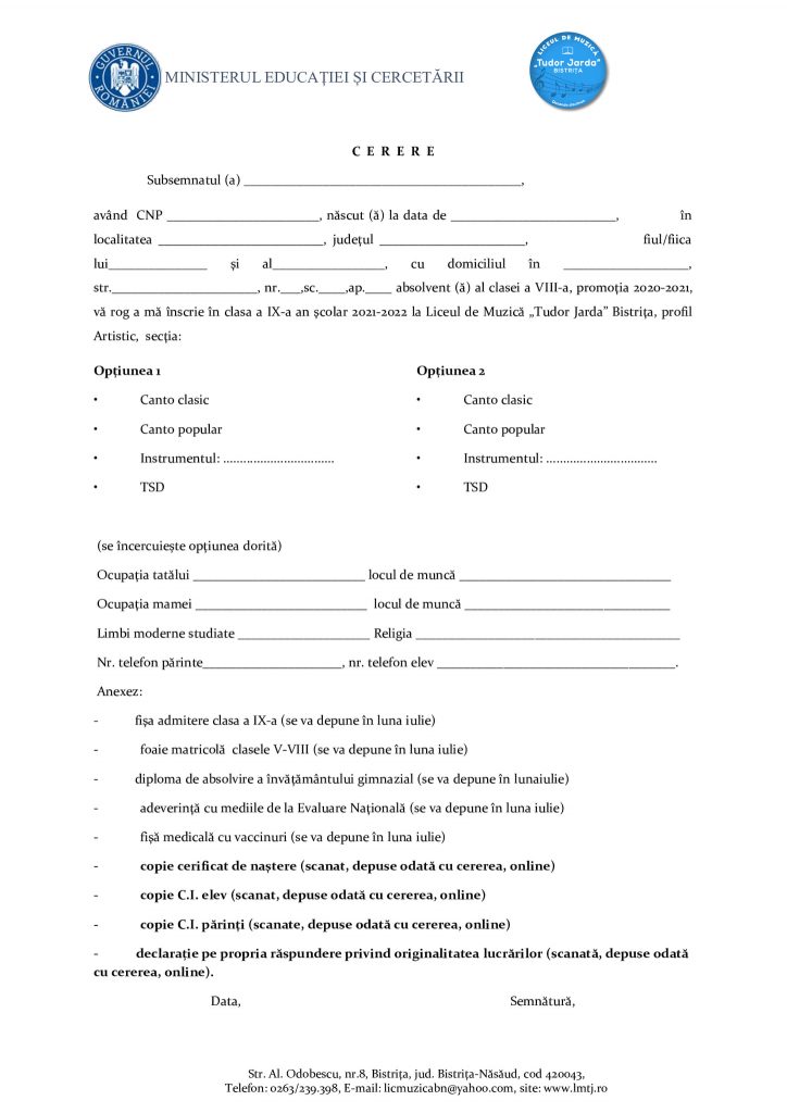 Dragi absolvenți, a venit momentul pe care noi l-am așteptat, și anume să ne cunoaștem. Cei care doresc să devină elevi ai Liceului de Muzică, specializarea Muzică, vor depune în perioada 7-14 iunie 2021 (orele 8-16), la secretariatul școlii noastre: