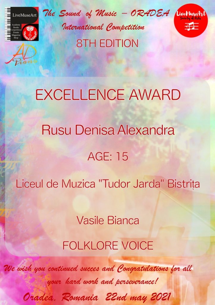 Rusu Denisa Alexandra, canto popular, cls IX – Excellence Award