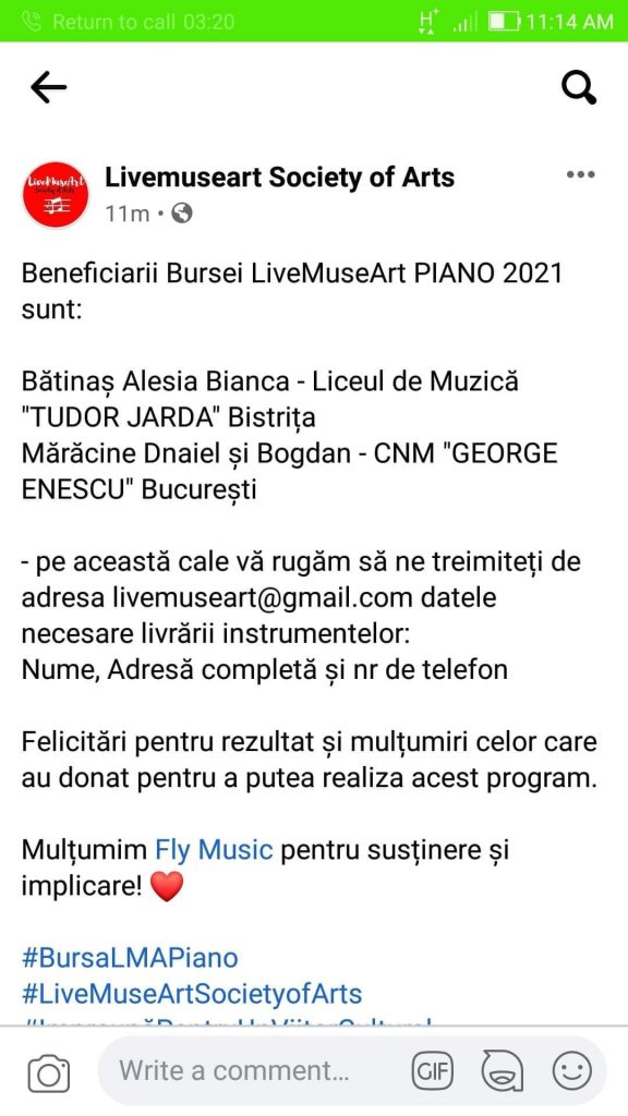 Excelentă performanță a Alesiei Bătinaș și a d-rei prof. Melinda Deac: Bursa LiveMuseArt PianoGeneral / iulie 20, 2021 iulie 22, 2021 / Leave a Comment Excelentă performanță a Alesiei Bătinaș și a d-rei prof. Melinda Deac: Bursa LiveMuseArt Piano. Felicitări !