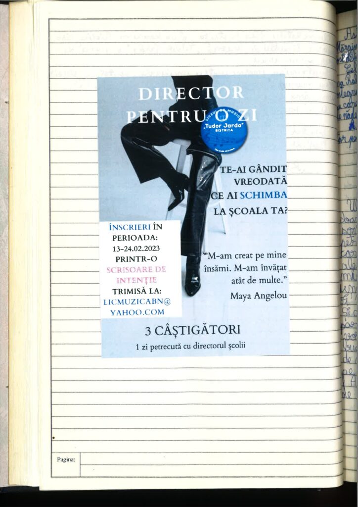 Cei 3 elevi câștigători ai Concursului ”Director pentru 1 zi”, Miruna Bologa (IV), Karla Cotu (XI) și Luca Ferenț (X), au evidențiat ziua petrecută alături de director, în Cartea școlii.