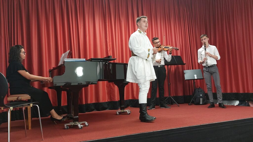 Elevii sunt insotiti si acompaniati la pian si vioară de prof. Vasile Bianca și Vasile Răzvan