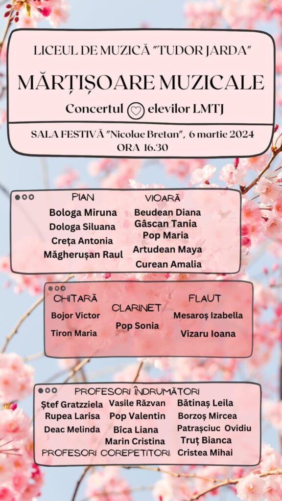 Vă așteptăm, Miercuri, 6 martie, de la ora 16.30, la un Recital dedicat primăverii, unde veti putea auzi elevi instrumentişti ai claselor V-VIII. In program:
