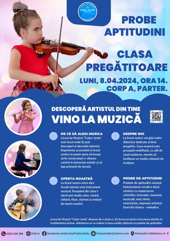 Luni, 8 aprilie 2024, de la ora 14 vor avea loc probele de aptitudini pentru înscrierea în clasa pregătitoare. Succes tuturor!!!