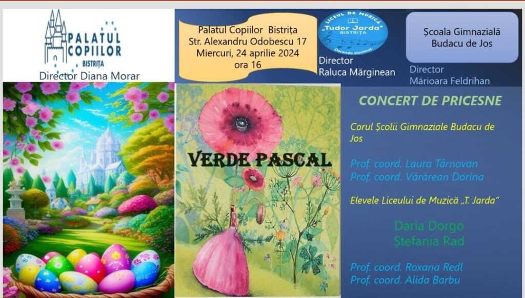 Recitalul de pricesne „Verde Pascal” a fost găzduit cu căldură de către doamna director prof. dr. Diana Morar la Palatul Copiilor Bistrita. Liceul de Muzica „Tudor Jarda” a fost reprezentat de catre Daria Dorgo, cls. a IX-a A si Stefania Rad. clasa a X-a A, sectia canto popular, profesori coordonatori Roxana Redl si Alida Barbu. Invitat special, corul Scolii Gimnaziale din Budacu de Jos, director Marioara Feldrihan, a fost coordonat de catre prof. Laura Tarnovan si prof. Dorina Vararean.