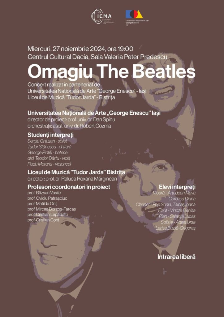 Va invităm la concertul „Omagiu The Beatles” desfășurat împreună cu Universitatea de Arte „George Enescu”, Iași, în 27 nov, ora 19, Centrul Cultural Dacia!