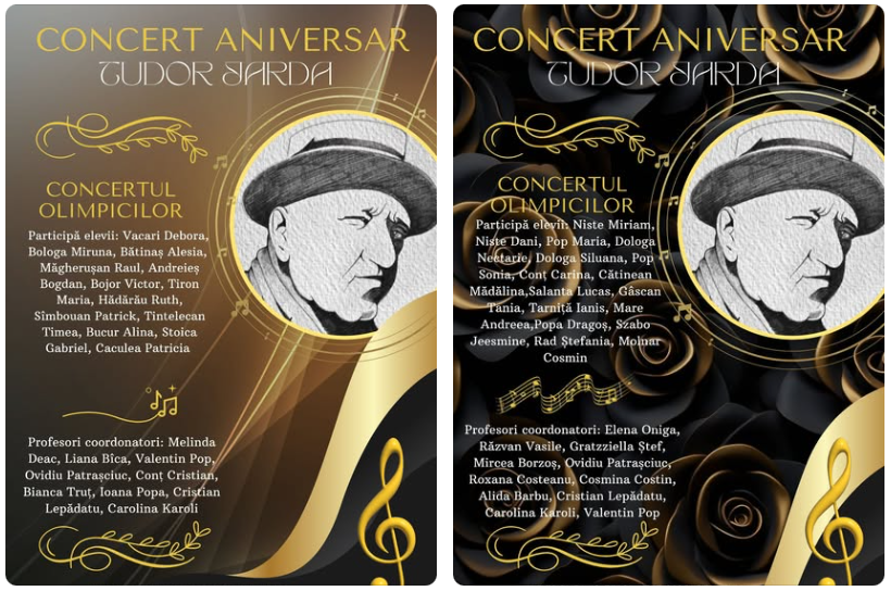 Vă așteptăm, cu drag, Marți și Miercuri la două Concerte Aniversare „Tudor Jarda” unde vor participa elevii olimpici de la catedrele de pian, coarde, suflători, canto clasic și canto popular.